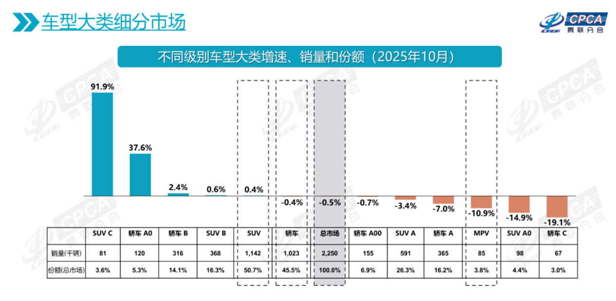 那么,一直在进化的中大型MPV市场,为什么成了整个车市的逆行者呢?其实原因也很简单,新能源化和智能化催生了另一个热门细分市场-中大型SUV,使用场景更广泛的中大型SUV,不动声色地蚕食了中大型MPV的市场份额,根据乘联会的统计数据,10月份C级SUV(含中大型和大型SUV)的销量同比大涨超过90%,1-10月的累计销量增长也超过了40%,成为了增长最快的细分市场之一。