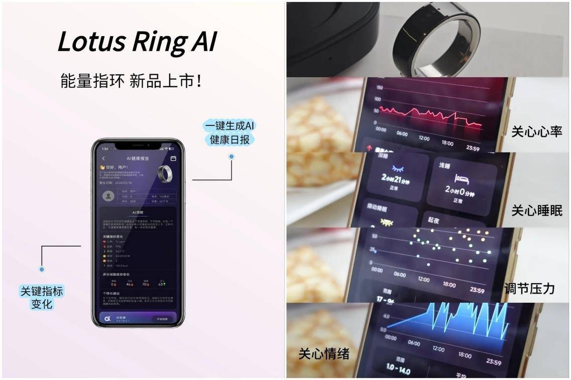 Lotus Ring AI能量指环不仅能动态精准监测数据,更有AI管理整体生活状态,破解健康焦虑,实现对睡眠、心率、血氧、体温、运动的动态监测,能够进行生活状态判断和预测。状态计算模型还能够关注压力、疲劳、情绪及身体恢复数据,从而能够综合分析个人整体状态,一键生成AI健康日报,给出改善建议。